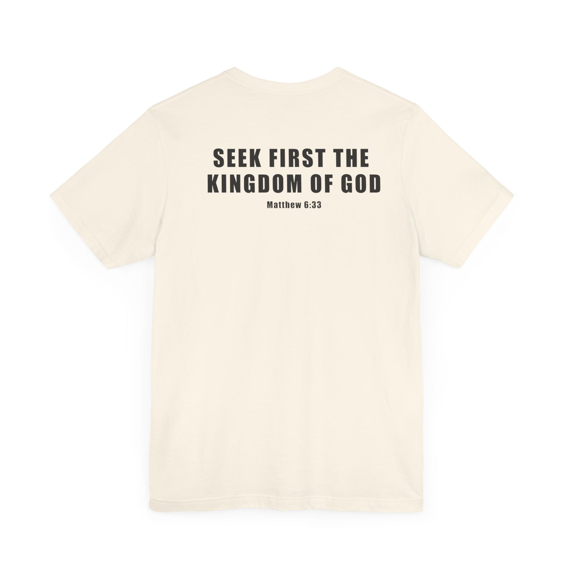 On the back "Seek first the Kingdom of God" Embrace your faith with our "Seek First the Kingdom of God" T-Shirt. Crafted from premium cotton, this shirt features a powerful message that serves as a daily reminder to prioritize spiritual values. Wear it proudly and let your faith shine. Seek first the Kingdom of God and let everything else fall into place.